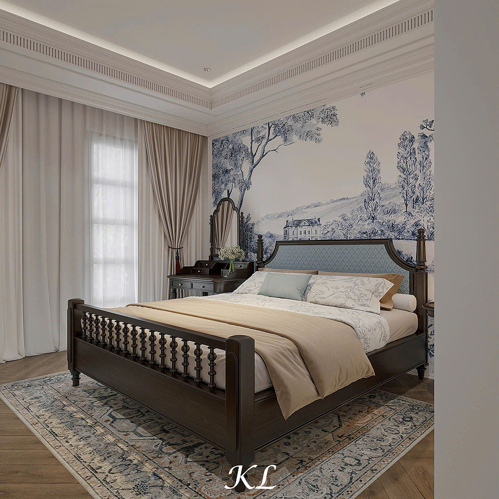 Trung tâm căn phòng là giường đôi cỡ lớn với khung gỗ cao cấp, màu nâu trầm