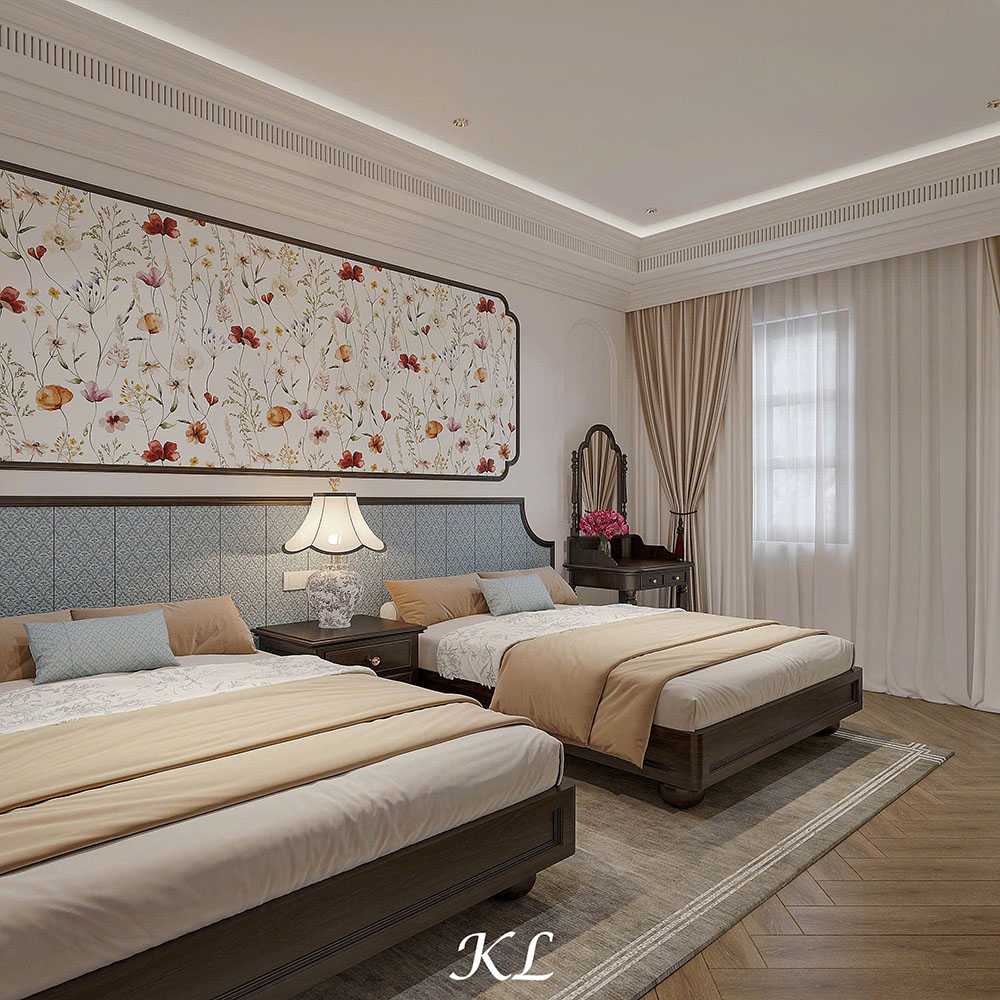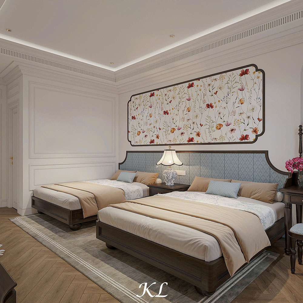 Phòng được bố trí hai giường lớn với khung gỗ cao cấp, chắc chắn, kết hợp